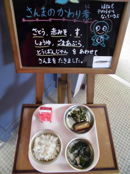 今日はごはんがよくすすむ「さんまのかわり煮」がでました。かわり煮とは,しょうが煮を作る時に使うしょうが,料理酒,三温糖,濃口しょうゆに加え,赤みそ,豆板醤,米酢ごま油をプラスして煮つける料理です。さまざまな調味料が入るのですが,見事に味がまとまってとてもまろやかな,ごはんによく合う煮つけなのです。米酢や鉄釜の力と,給食調理員さんの愛情で,背骨もさくさくとまるごとおいしく食べられました。