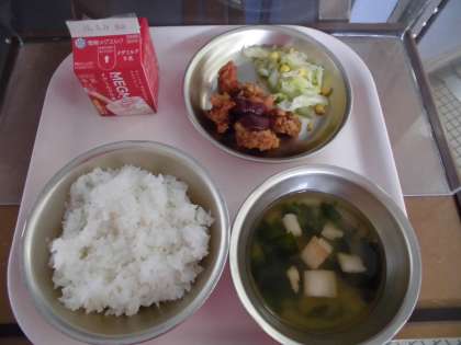 今日はチキンカツもソースもすべて給食室で1から作る手づくりこんだてでした。カツ定食のような今日のこんだてを子どもたちは喜んで食べていました。今日のみそ汁は添加物を使わずに京都府内産の大豆と米麹で丁寧に作られた「京北みそ」を使用しました。からだのやさしい地産地消のおみそ汁でした。具として入っていたやわらかいおふが人気でした。