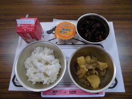 今日は肉じゃがのカレー味でした。豚肉を使った肉じゃがです。給食には「カレー味」のほかにスタンダードな「しょうゆ味」の肉じゃがと,豆板醤を少し加えて作る「ピリ辛みそ味」の肉じゃががあります。給食室の釜でほっくりと煮込まれた肉じゃがはとってもおいしいです。今日は,1年生の保護者の方々を対象に給食試食会が行われ,給食に込められた思いや願いを知っていただき,子どもたちの給食時間を参観後には試食をしていただきました。みなさんからも,カレー味の肉じゃがが好評でしたので,レシピを紹介します。