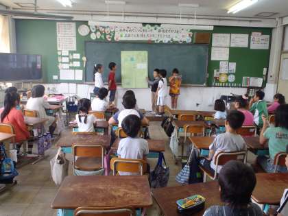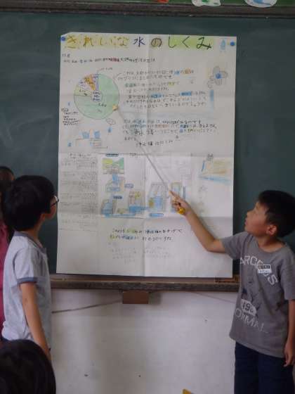琵琶湖の水をきれいな水に変身させているのは「浄水場だった!」ということを知り,総合ではその浄水場のしくみや使った水の行方について調べてきました。グループごとに一生懸命調べまとめた壁新聞。水環境保全センターのしくみについても調べ微生物の存在についても知りました。このことをきっかけに自分たちにできることを考えていきました。節水はもちろんですが,「ごみを水道に流さない」「洗剤やシャンプーを使いすぎない」などたくさんの意見が。どのグループもしっかりとまとめ,しっかり聞き,考えることができた発表会となりました。ぜひこれからの生活に活かしましょう。
