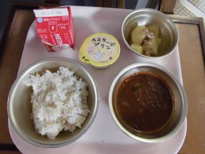 今日はことことじっくり煮込まれたハッシュドビーフでした。「ハッシュド」とは「こま切れ・薄切り」という意味があり,こま切れにした牛肉を使ったシチューのことをいいます。ハッシュドビーフには濃い茶色に炒めた手づくりのルーを入れて仕上げます。コクのあるシチューを麦ごはんにかけて「ハヤシライス」にして食べました。ジャーマンポテトは薄味なのですが,ベーコンの塩気がほんのりとついていてじゃがいもの甘みが引き出されてとてもおいしくいただけました。