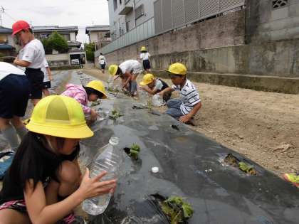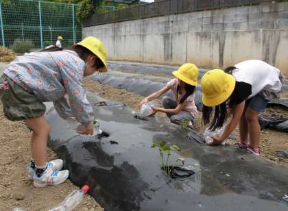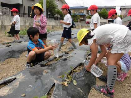 今、2年生は生活の時間に植えたさつまいもの苗の水やりを毎日がんばっています。2Lのペットボトルに水を入れて、桂高校の農園まで歩いていきます。秋には、大きなさつまいもが収穫できるようにがんばって世話をして下さいね。