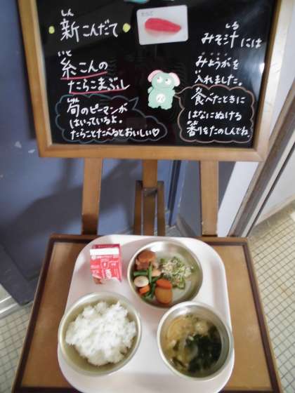今日の給食には新こんだてが登場しました。「糸こんのたらこまぶし」です。給食では初めて使用する「たらこ」と糸こんにゃくとピーマンを一緒に炒めて調味します。ピーマンが苦手な子どもたちが多いですが,たらこと合わせることで食べやすくなります。また,給食室ではピーマンの苦みを抑えるために,よく炒めて仕上げました。「みそ汁」にはこれからが旬をむかえる「みょうが」を入れました。