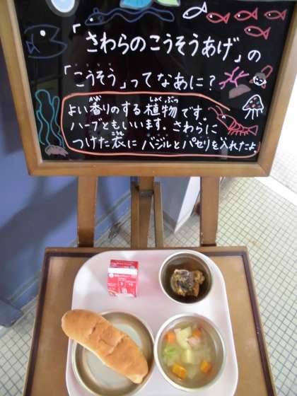 今日はおしゃれなこんだてでした。主菜の「さわらの香草あげ」の衣に,名の通り香草を混ぜてからっと油で揚げました。香草は,生のパセリと乾燥バジルを使いました。給食室から漂ってくる香草あげの香りは,どこかのレストランのそばを通った時に香るにおいでした。年間3回登場する貴重なチーズコッぺパンとスープとともにおいしくいただきました。ごちそうさまでした。