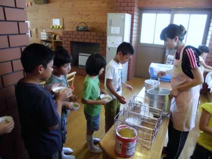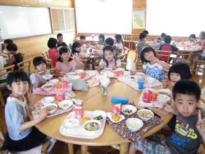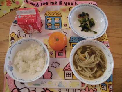 今日は,暑い日にぴったりの嬉しいこんだてでした。カレーうどんと,デザートに冷凍みかんが出ました。カレーうどんはスパイシーな風味ととだしのうまみが合わさり,スープごとおいしくいただきました。給食では,スープまでおいしく食べられるように,天然のだし(だし昆布とけずりぶし)をきかせています。だしをきかすことで塩分が少量におさえられます。デザートは,今年初の冷凍みかんでした。しゃりしゃりに凍ったシャーベットみたいなみかんをおいしそうに食べていました。