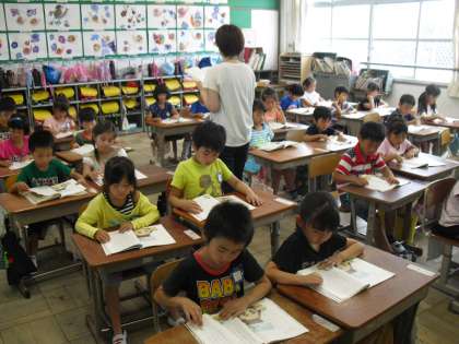 先生が読むのを指で押さえながら,お話の内容を確認します。