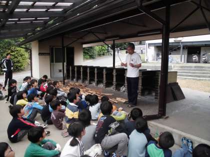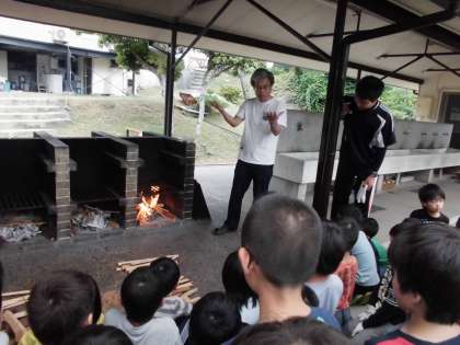 かまどでは、野外炊事恒例の校長先生による「かまどの火のたき方講座」がひらかれております。