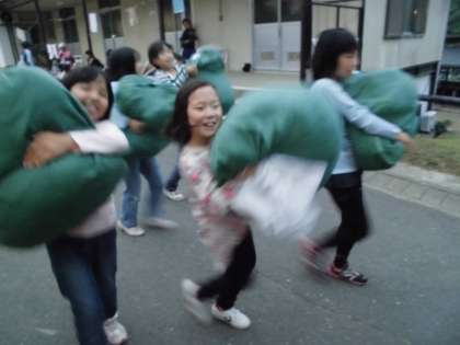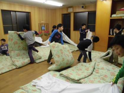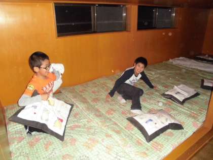 男子は楽しそうに就寝準備をしていますが、女子は寝袋を持つだけで精いっぱい。