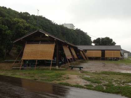 雨の東屋で朝食です。