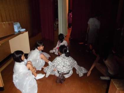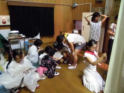 いよいよ学習発表会の本番まで、あと1週間を切りました。今日は、舞台そでの様子をお見せいたします。自分の出番を待ちかまえる舞台そででは、台本を一生懸命確かめたり、リラックスして談笑したりするなど、いろいろな顔が見られます。緊張しないで、力いっぱい演技できるといいね。