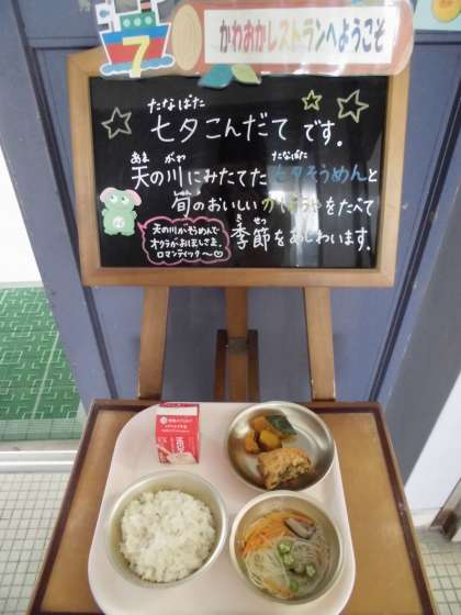 今日の献立は行事献立の「七夕そうめん」です。この「七夕そうめん」は、「カレー」や「プリ中」ほどの絶大な人気をほこる献立ではありませんが、離任式などではよく「給食調理員さんのつくってくれた七夕そうめんは、すごくおいしかったです。」などといわれる地味ながも多くの支持者をもつ地味系人気献立です。