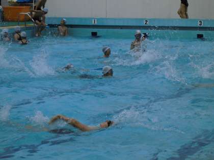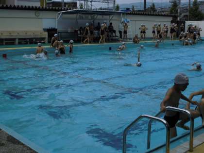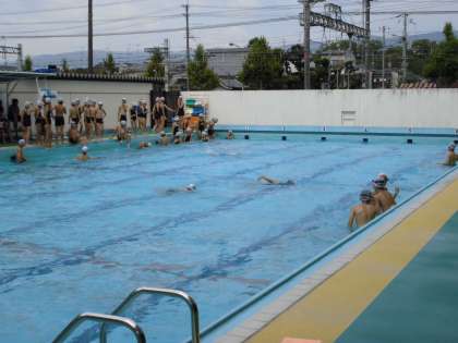 今日はうす曇りでしたが,プールの気温はすでに31度を超えていました。ねらい1の「今できる泳ぎ方で距離やタイムに挑戦」した後,ねらい2の「新しい泳ぎ方に挑戦」しました。二人組でアドバイスしたり,励まし合ったりしながら楽しく活動しました。