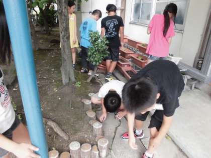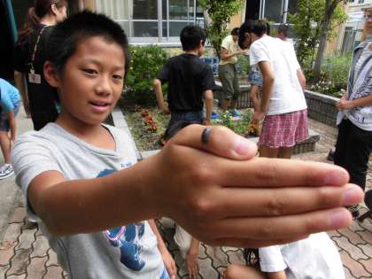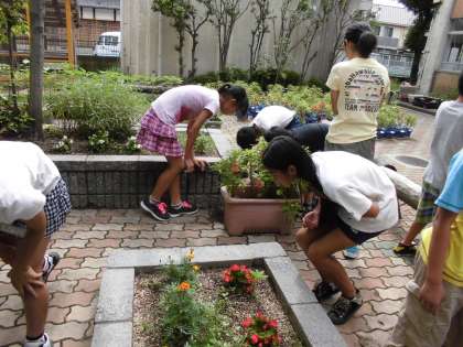 今日の理科は、植物を食べている小さな生き物について調べるためにダンゴムシをつかまえにいきました。プランターの下や植木鉢のすみ、枯れ葉の下など、みんなでダンゴムシがいそうなところを探しに行きました。さすが人気者のダンゴムシ。どんな所に住んでいるのかみんなお見通しで、5分間でたくさんのダンゴムシをつかまえられました。もう6年生なんだから、ポケットに入れて持って帰ったりはしないでくださいね。