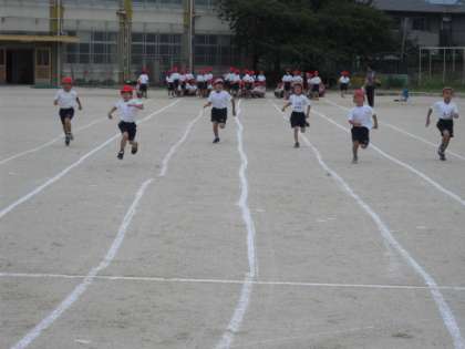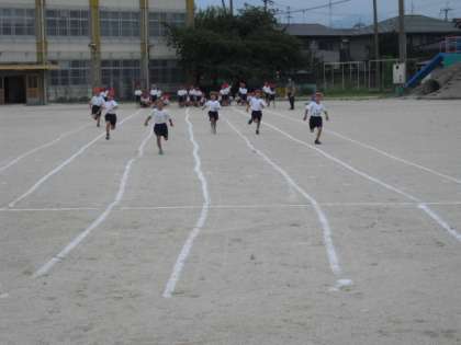 ゴールまで力を抜かず一気に走りぬけるのは大人でもなかなか難しいですが,皆ありったけの力を出そうと頑張りました。真剣な表情から一転,走り終わった後は,とても眩しい笑顔を浮かべていました。