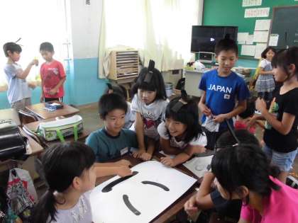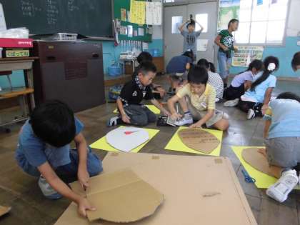 今日はみんなで小道具づくりです。みんなで一生懸命作ったちょんまげをつけながら、仲よく楽しそうに活動していました。
