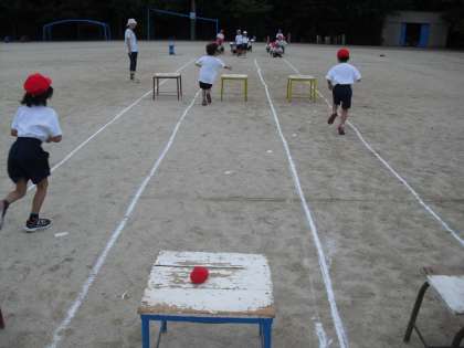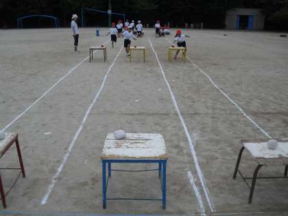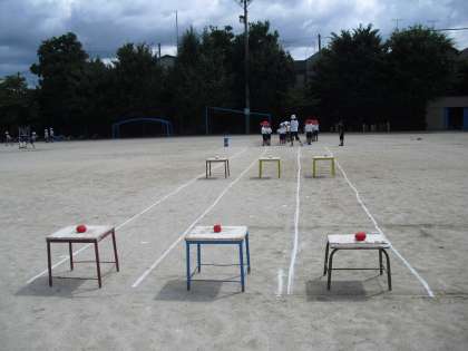 体育で,置替えリレーをしました。二か所の球を入れ替えながら次の人へとつなげます。