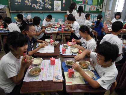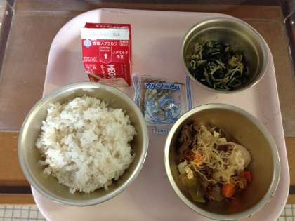 今日の主菜は「肉どうふ」でした。牛肉ととうふをメインに,野菜や糸こんにゃくと一緒に甘めのだしで煮こみました。すき焼きに似た味のおかずです。豆腐や玉ねぎ,にんじんにだしと牛肉のうまみがしみ込んでいて,とてもおいしくいただけました。明日から2回目のランチルーム給食が始まります。6年1組からスタートです。楽しい給食時間にしましょう♪