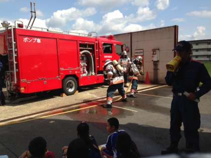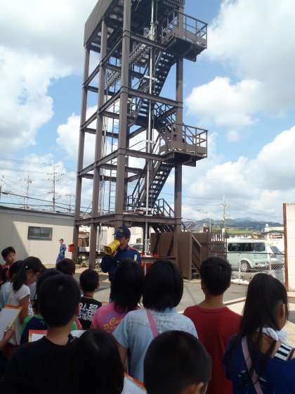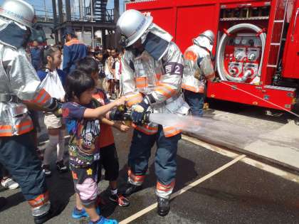救助隊や消防隊の訓練の様子も見させていただきました。そのあとは,一人ひとりがポンプで消火活動をする体験もさせていただきました。貴重な体験に子どもたちは大喜びでした。