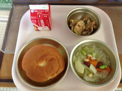 今日の副菜の「野菜のスープ煮」は,じゃがいも,にんじん,玉ねぎ,キャベツをたっぷり使い,スープが少しとろっとするくらい野菜を煮込みます。今日は,いつもの「野菜のスープ煮」にミックスビーンズを入れました。手ぼう豆,枝豆,大豆,金時豆の4種の豆が入り,いつも以上にカラフルな仕上がりになりました。豆類には良質なたんぱく質と食物せんい,ミネラル分がふくまれています。子どもたちがおいしく楽しく食べられるように工夫しながら,いろいろなこんだてに取り入れています。