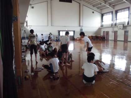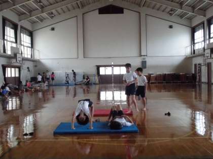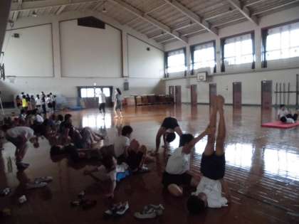 朝休みに続々と体育館に集まる6年生の姿!今日も秘密の練習をやっていました。倒立や一人技の練習を友だちと協力してやっています。