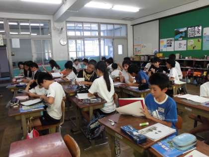「比例と反比例」の学習の3時間目。めあては「2つの数量が比例しているか調べよう」です。比例しているかどうかは,表を横に見たり,縦に見たりして,比例のきまりに当てはまるかを考えるといいですね。