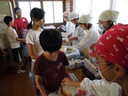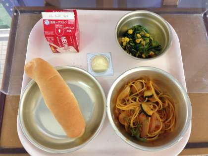 今日はイタリアンスパゲティでした。具は夏野菜のトマト,ピーマン,ズッキーニを使いました。夏の太陽をたっぷり浴びて育った夏野菜もそろそろ終わりです。パワーの詰まった野菜をおいしく食べることができました。今日はチキンフランクも入っていてボリュームのあるスパゲティでした。ランチルーム給食は6年3組でした。おかわりも大盛況であっという間に売り切れました。ごちそうさまでした。