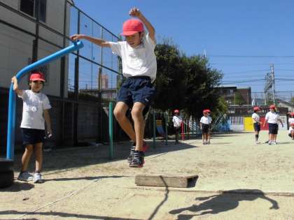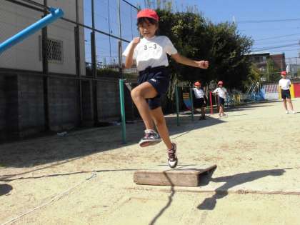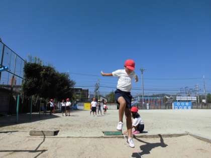 3年生の体育は、幅跳びです。踏み切り位置を踏切板にして、大きく跳べるようにがんばっています。助走をうまくいかしながら、踏み切れましたか?