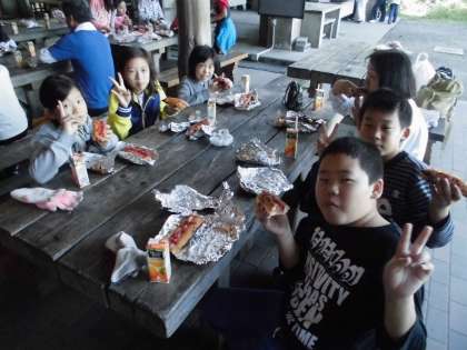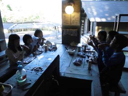 パックドックでは,できたてほかほかで,みんな「むっちゃおいしい!」と満足気。「自信作」ができてとてもうれしそうでした。