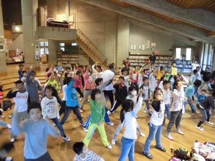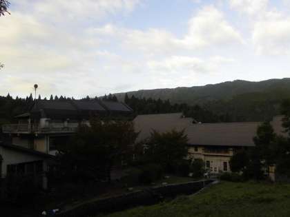 写真は6時のさわやかな朝をむかえた山の家の様子ですが、今では雲ひとつないきれいな青空が広がっています。朝の集いでは,みんなで楽しく目覚ましの運動を行いました。