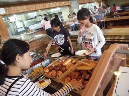 今日の朝食は、パン、ごはん、みそ汁、コーンスープ、牛乳、ジュース、お茶、オムレツ、ミートボール、春雨きんちゃくの煮物、レンコンのてんぷら、キャベツ、なっとうのどのうちから、好きな料理を選んでいただきました。