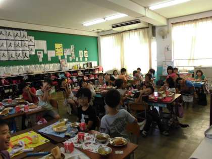 今日は,週一のパン給食で,黒糖コッペパンでした。主菜の「トマトシチュー」とよく合う献立でした。トマトシチューは,少しトマトの酸味がきいた味つけで,夏の定番のシチューです。副菜は「アスパラガスのソテー」で,グリーンアスパラガス・にんじん・キャベツがたくさん入った和風の味つけのおかずでした。