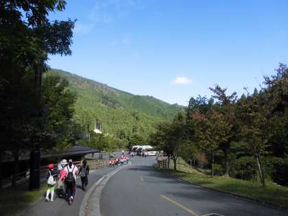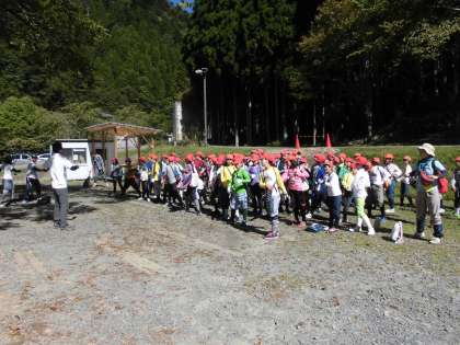バスに乗って交流の森まで移動して、登山に向けての準備運動です。