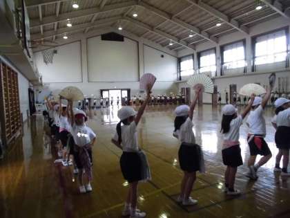 今日のめあては,「いろいろな動きを友だちと一緒に覚える」でした。「は!」のかけ声もずいぶん出るようになっています。動きをそろえることは,みんなの心を一つにすることです。がんばってね!扇子さばきも板についてきましたね!