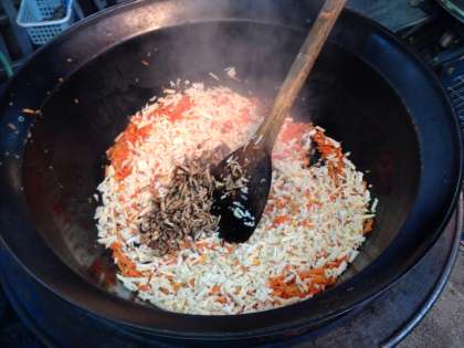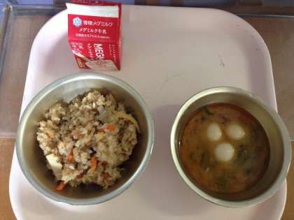 今日の給食は,台風に備えて学校で保管してある缶詰や乾物,乾燥野菜,米を使って作りました。「たきこみ五目ごはん」は給食室の大釜を使って炊きました。1釜で約200人分のごはんを炊きます。具としてツナフレーク,干ししいたけ,にんじん,たけのこを入れ,中華風の味に仕上げました。釜で炊くごはんならではのおこげも出来て,ふっくらごはんと香ばしいおこげの両方を楽しみながら食べていました。みそ汁は,乾燥小松菜と乾燥ごぼう,うずらたまごの入ったみそ汁でした。ごつそうさまでした。