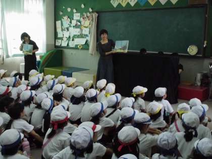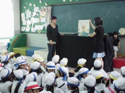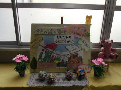 今日は全校練習の後の中間休みだったので,みんな体操服で集合しました。今日もたくさんの子どもたちが集まりました。今月も「むしたちのうんどうかい」と「ともだちや」の2冊の読み聞かせです。