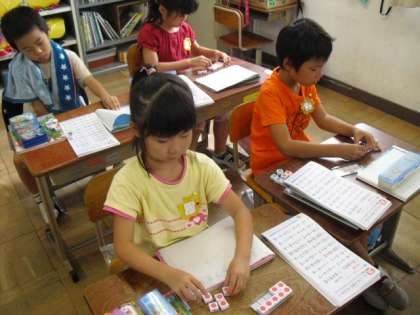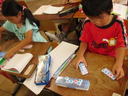 10を超えるたし算の練習で,計算の仕方を考えます。ブロックを使って言葉の式で確認しました。10のまとまりを作る方法で,どんな問題もすいすい解けます。