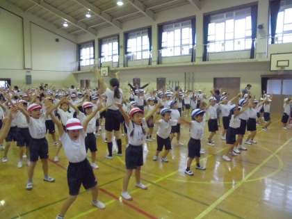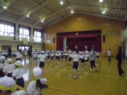 体育館では中間休みに全校ダンスの練習がありました。1年生は初めてのダンスです。うまく踊れたかな?