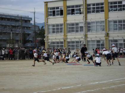 今までゴムのとび方やコーンのまわり方を工夫しながら,一生懸命練習してきました。ゴール目指して最後まで力いっぱい走っています!