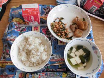 今日はセルフ混ぜご飯のこんだてでした。具は,さけフレークと細かく刻んだ大根葉,ごまを炒めて塩としょうゆで軽く味つけしたものです。教室で各自ごはんに具を混ぜます。普段,野菜の苦手な子どもたちも混ぜご飯にするとおいしく食べられるようです。今日は2年1組がランチルーム給食でした。4時間目に食の学習で学んだ「正しいはしのもち方」を思い出しながら,動かしにくいはしを頑張って動かしている子,こつを掴んで動かせるようになった子の姿が見られました。根気よく続けて正しいはしのもち方を身につけてほしいです。