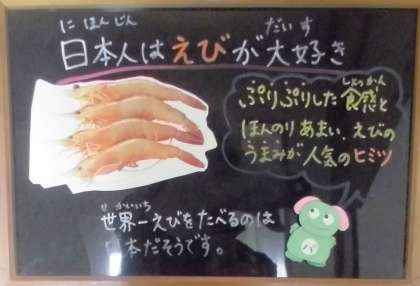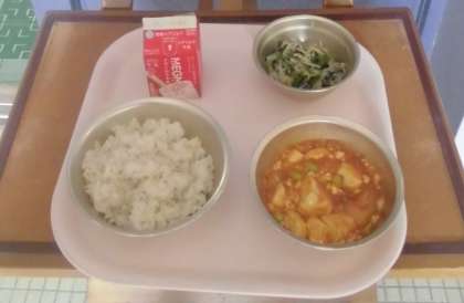 今日の献立は、エビと豆腐のケチャップ煮です。今、世間をにぎわせているエビ料理ですが、学校給食では芝エビや車エビなどは使わず、献立表記通り「むきエビ」を使っています。ケチャップ味でおいしく味つけられており、みんなでおいしくいただきました。