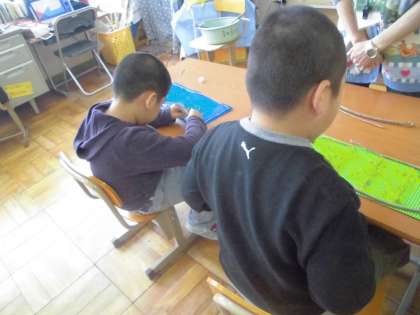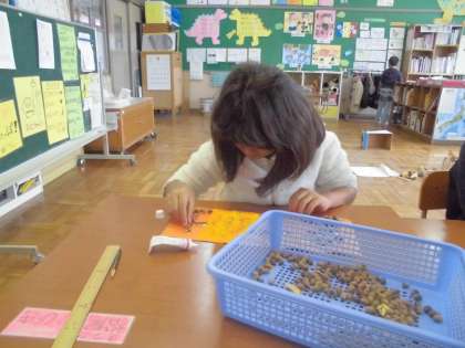 今日の図工は「秋の工作」です。ドングリや枯れ葉、枯れ木などを使ってネームプレートを作りました。ボンドをぬった上に、ていねいにドングリをならべて名前をつくっていきます。枯れ葉や枯れ木をつかって、かわいく飾り付けして下さいね!