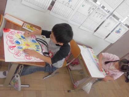 今日はのってみたいものを実際に画用紙に書いていきました。電車や観覧車をはじめ、さまざまな動物にのっている絵をパスを使って描いています。楽しそうな絵がいっぱいですよね!