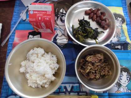 今日はセルフこんだての日でした。ごはんに牛丼の具をのせていただきます。牛丼チェーン店のようにつゆだくにはできませんが,玉ねぎと牛肉のうまみたっぷりの牛丼でした。「ほうれん草のおかか煮」や,はしやすめの「金時豆の甘煮」もおいしくおなかいっぱいいただきました。