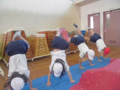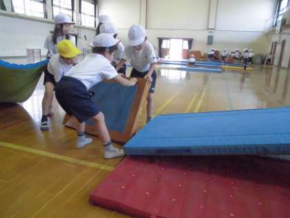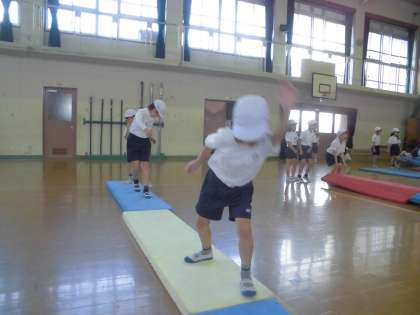 2年生は体育の時間に「マットあそび」の学習をしています。自分たちで協力しあって場作りをし、学習を進めています。細い場や長い場、高い場や坂の場などいろいろな場をまっすぐ回れるようにがんばっています。