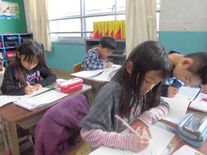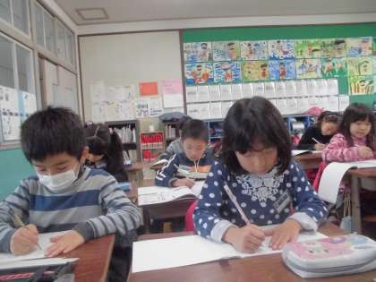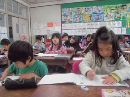 今日の国語は、漢字の学習です。今までに習った漢字を思い出しながら、ていねいに書いていきました。姿勢にも気をつけて、みんながんばっています!!
