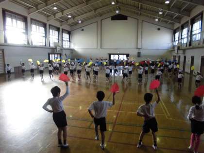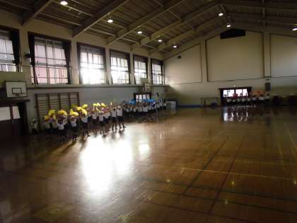 生活科で交流している桂高校のお兄さんお姉さんへ「おれいの会」をするために体育館で出し物の練習をしました。来週の水曜日,さつまいもや大根をお世話してもらったお礼に来てもらいます。どんな「おれいの会」になるのか楽しみですね!