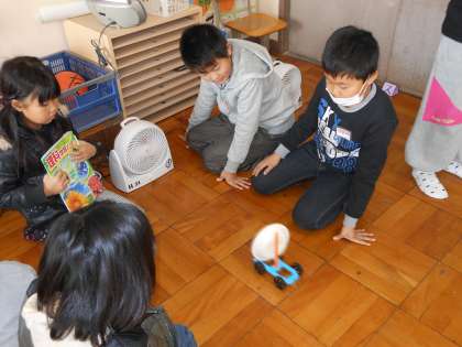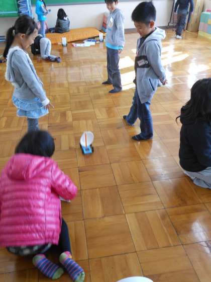 理科の時間に、風を受ける紙を大きくしたり小さくしたり、風を受ける部分を紙以外のものにかえ、車の動き方の違いを調べました。何が一番速く動きましたか?