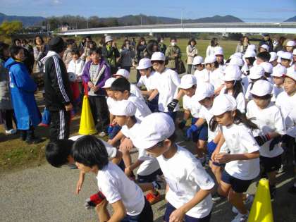 5年生がスタートする頃にはまぶしいくらいの好天気になりました。朝休みに大文字駅伝の練習している6年生に食らいついて練習している子もいます。