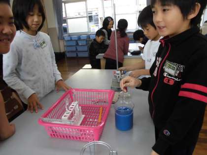 今日は,前の時間に学習した「金属の温まり方」をもとにして,水の温まり方を予想して調べていきました。実験では,水の温まり方がよく分かるように「サーモインク」を混ぜて調べました。温まる前は青色だったのに,温まるとピンクに色が変わっていきました。マジックのようで驚きの声が上がっていましたが,ちゃんと水の温まり方の様子も観察できましたね。