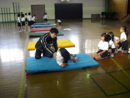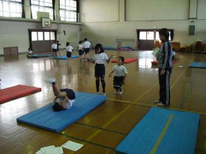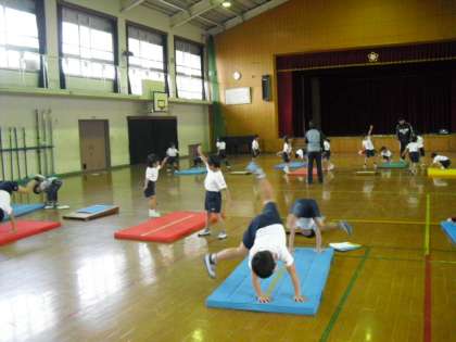 今日は,手の付き方に気をつけながら練習しました。先生に,「ほら,できた!」と言われ満面の笑みを浮かべながら,今度はグループの友だちの回り方や手,合図をしっかり見て,教えてあげたり応援したりしていました。